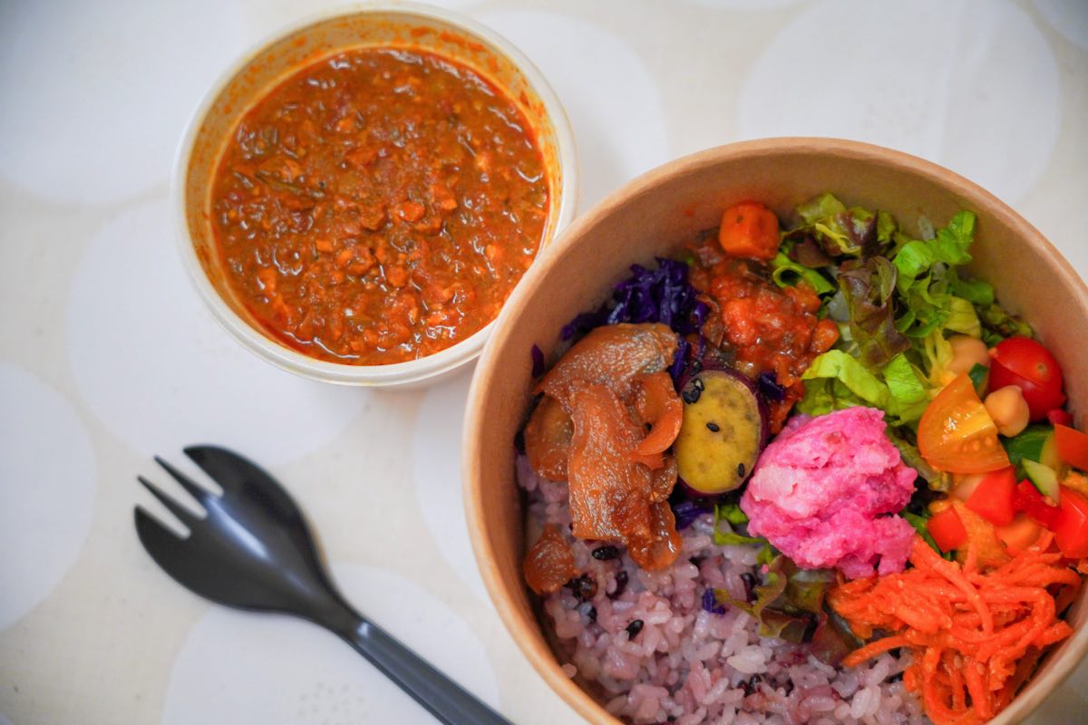 “カラダが喜ぶ美味しい日本のごはん”をコンセプトに、減農薬や県産の食材、糀などの発酵食品を使ったおにぎりや薬膳カレーのほか、お惣菜やお弁当のテイクアウトができるので、おうちや仕事の休憩中にも利用できそう♪