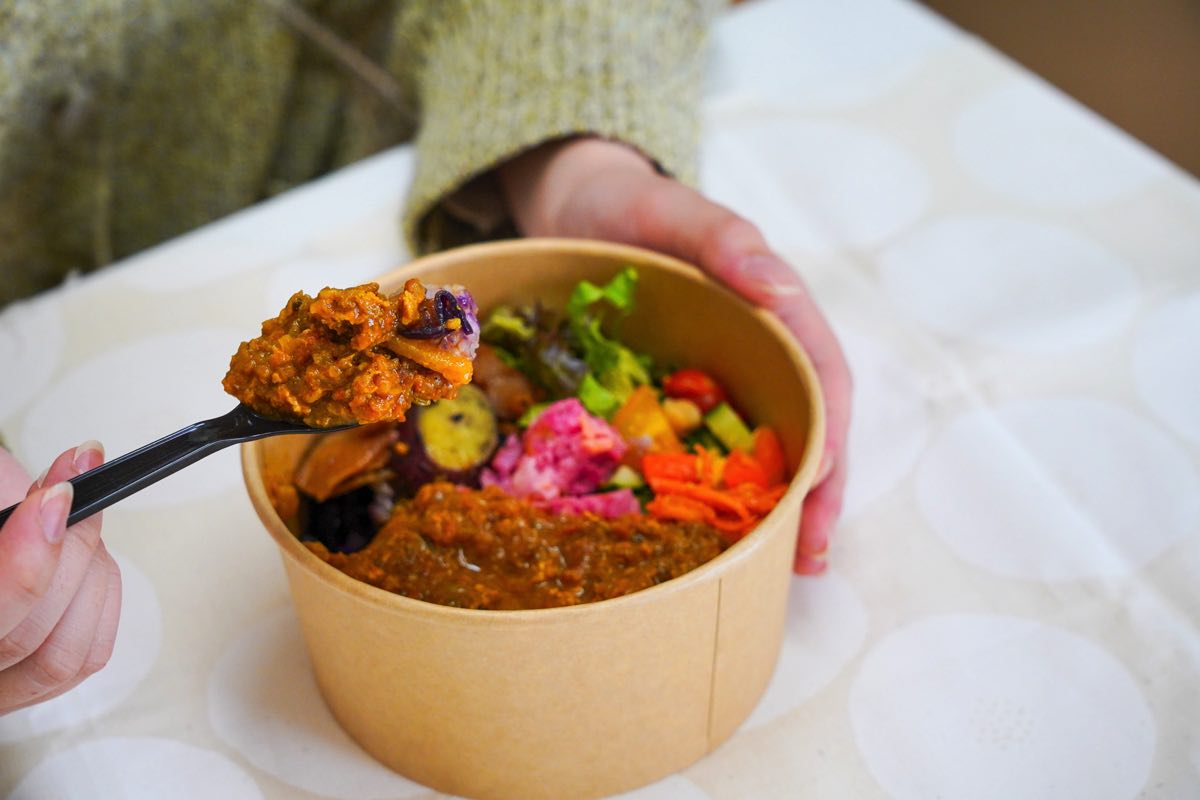 次は、スタッフのYOOさんお手製の薬膳カレー!14種類のオリジナルスパイスを配合したカレーは辛味もなく、とっても食べやすい。付け合わせには、数種類の副菜がたっぷり入っているので、ボリューム満点なうえに栄養も摂れるのが嬉しい。身体も整い、スタミナもつけられるので、今からの時期にぴったりなひと品。