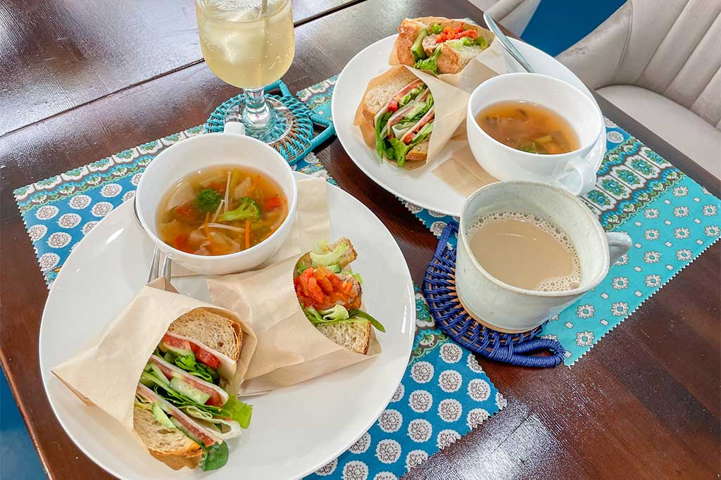 自家製の全粒粉パンは、外はカリッと中はふんわり!どちらもたっぷりの野菜入りで、ボリューム満点にいただける。「ハンバーグサンド」のハンバーグには、つなぎとしておからや豆乳を使っていたり、野菜スープには10種類の野菜やきのこ、七賢の酒粕が入っていたりと、身体に優しいこだわりが盛りだくさん。