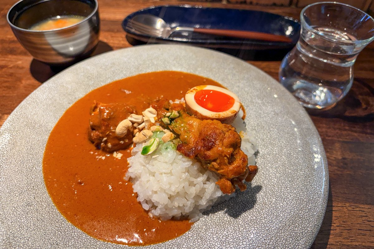 そしてランチの特製バターチキンカレー。バターチキンカレーというと甘めなイメージが強いが、20種類のスパイスをブレンドし、かなりスパイシーに仕上げるのが本田流。体の中からぽかぽかと温まり、汗がじんわりとにじむ。ほろっとやわらかくほどけるチキンと明野の卵のアチャールで、さらにコク旨!
