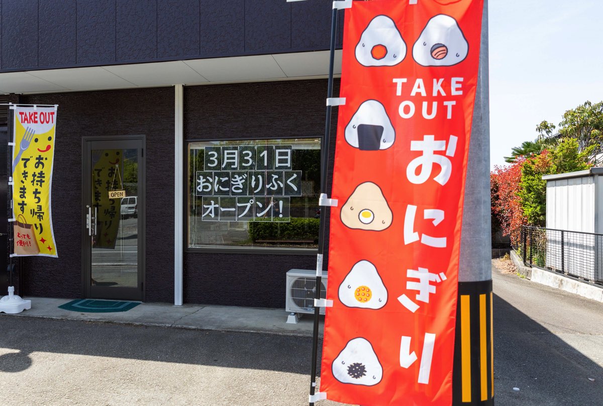 山梨県道313号藤垈石和線沿いのテナントの一角に、2025年3月31日オープンした小さなおにぎり専門店「おにぎり ふく」。真っ赤な「おにぎり」ののぼりがはためく。