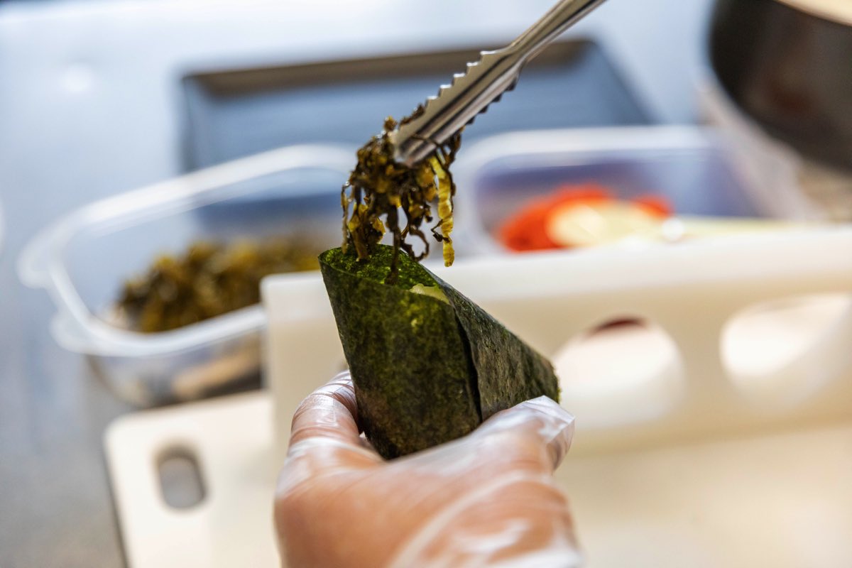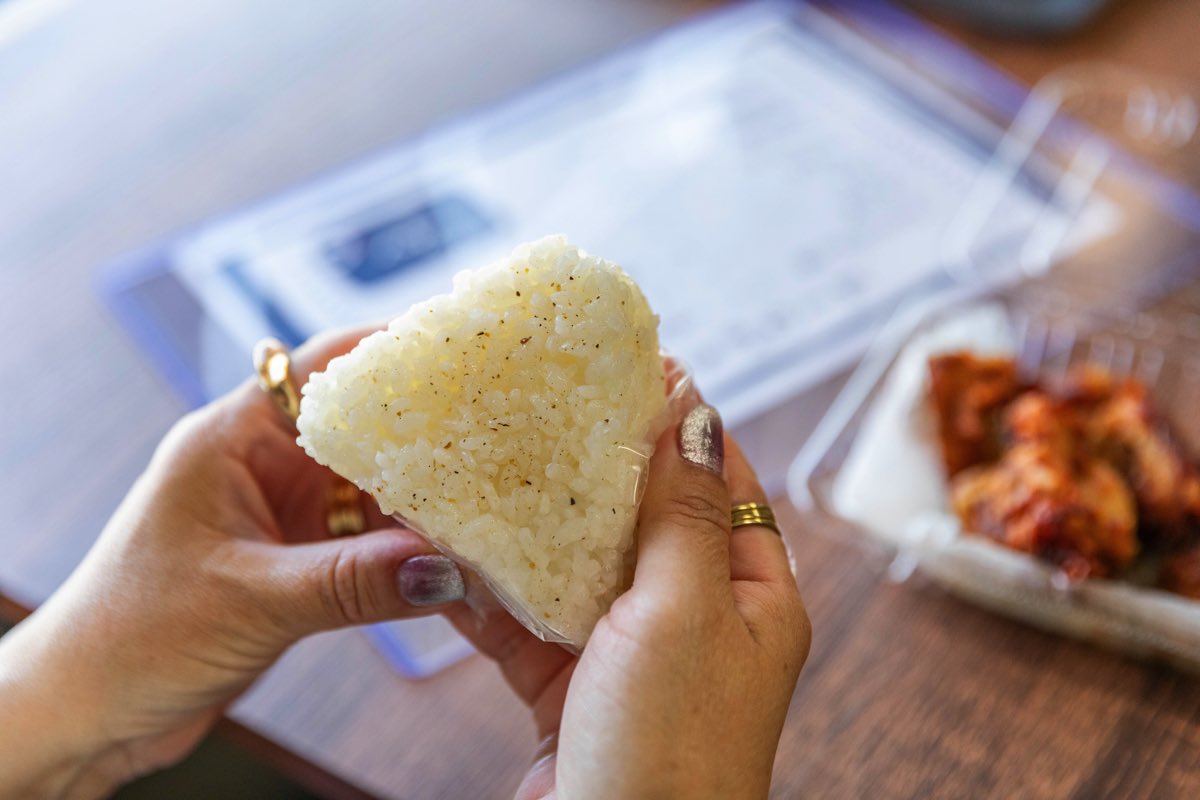 お米の粒感が際立ったおにぎりは、ふんわりふっくらとした仕上がり。寿司用のこだわりの海苔がしっかり支えるように巻かれているから、崩れることなく食べやすいのもポイント。食べると口の中でほろっとほどけていく。