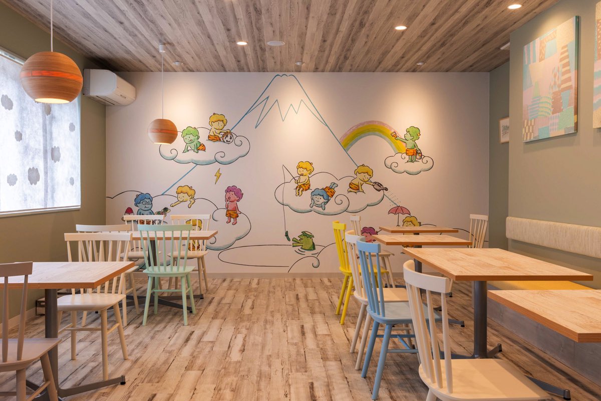 テイクアウトはもちろん、奥のカフェスペースではイートインも楽しめちゃう。カフェスペースの可愛すぎる大きな壁紙は、なんと店主の手描き!