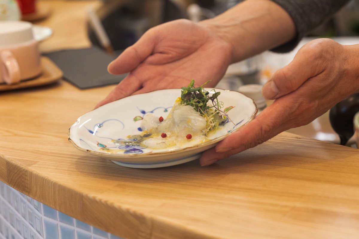 淡路島から届いた天然ひらめのカルパッチョは、有田焼のうつわで。