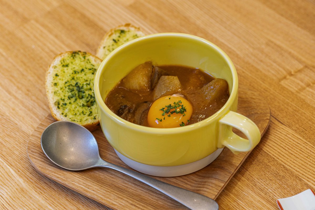 様々な色のバリエーションが楽しいスープカップは温かみにあるデザインで、手にもなじみやすい。山梨名物の「馬もつ煮」を赤ワインで風味づけしたデミグラスソースは一見洋風なのだが、後味に和のお出汁と甲州味噌が香る。ガーリックトーストをつけながら食べても◎!