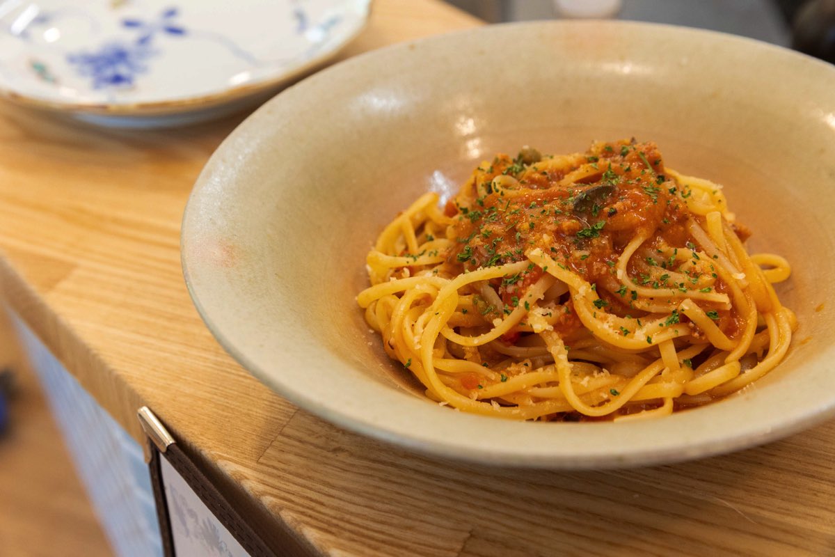 淡路麺業の生パスタが美味しすぎて、この麺の風味を最大限に味わってほしいからと、もちもちの食感を邪魔しないようにソースに濃度をつけているという。タコのラグーに麺をからめながらいただこう。