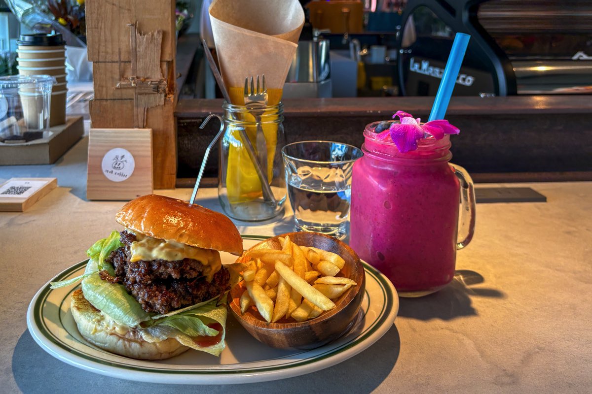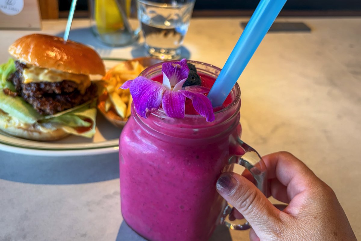 本日は、看板の「1to8 スマッシュバーガー ポテトセット」と、ビビッドピンクのドラゴンフルーツのスムージーをポチッ。