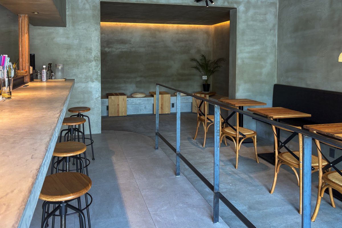 入ってすぐカウンター席とテーブル席があり、奥にはおひとり様用のベンチシートも。木の温もりにコンクリートのクールな質感がスタイリッシュな奥行きのある空間を演出する。