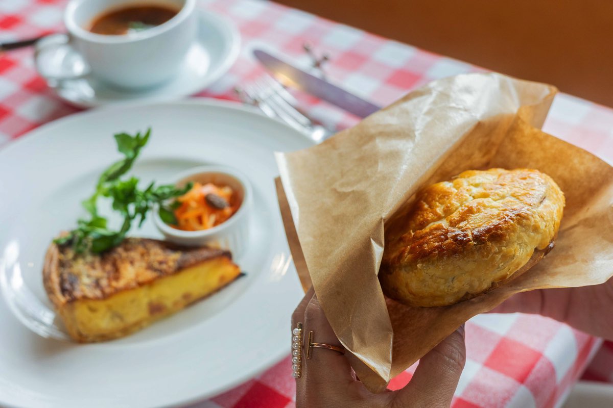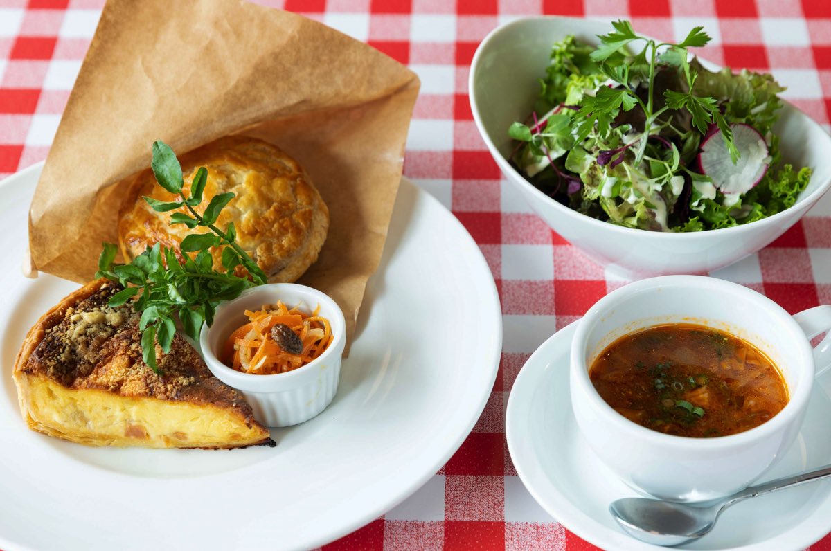 ランチにはキッシュとミートパイの両方が楽しめ、デザート、コーヒーまたは紅茶が付いたお得な「パイセット」もあり。