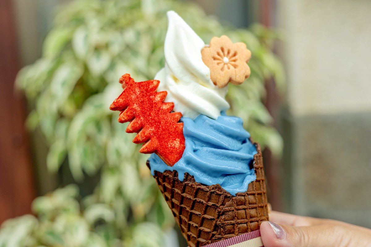 一番人気は、富士山をイメージした青と白のコントラストが美しい「富士山ソフト」!新鮮なミルクと、スーパーフードの王様「スピルリナ」から抽出した天然色素で青いソフトクリームをミックスする。食べ進めると、最後にもミルクソフトがあらわれ、満足度倍増~。