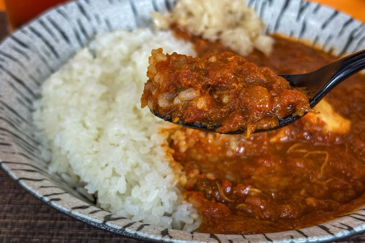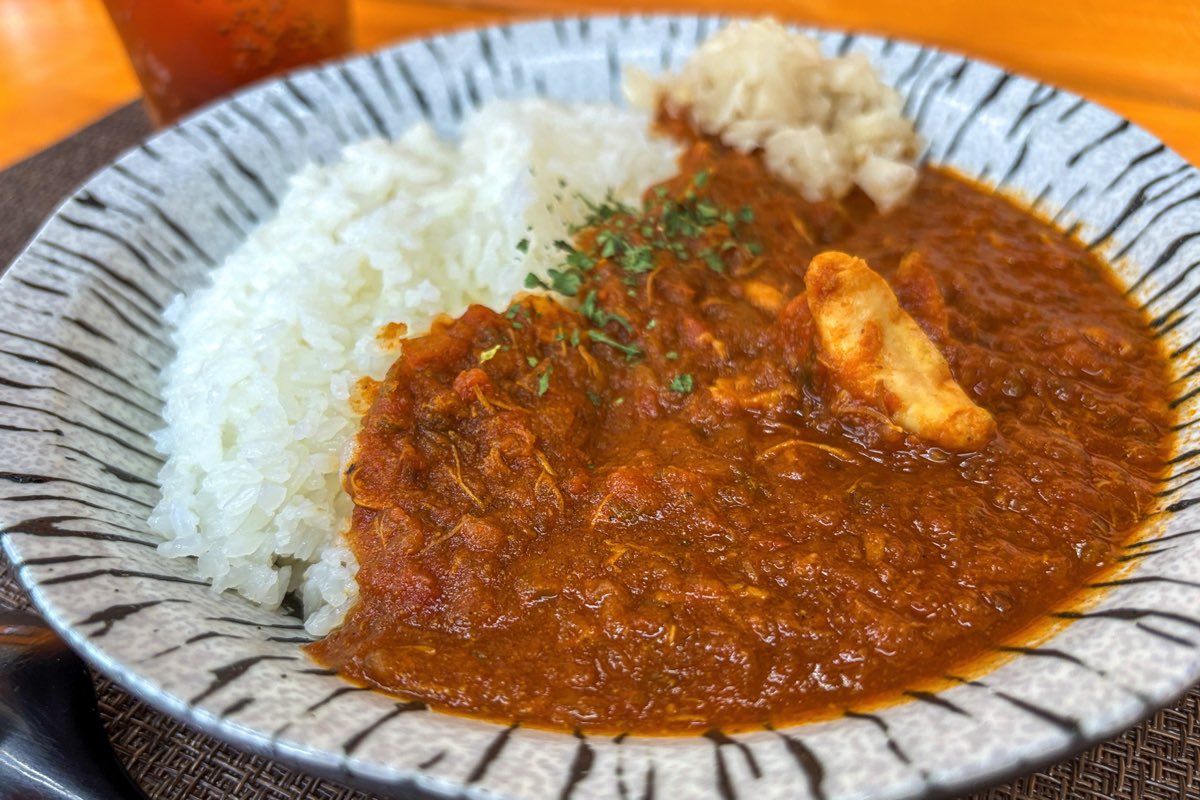 本日は、キーマよりちょっと辛めだというチキンカレーをチョイス。数種類のスパイスをオリジナルブレンドし、ほとんどトマトと玉ねぎのみという野菜の水分で濃厚な味わいに仕上げる。