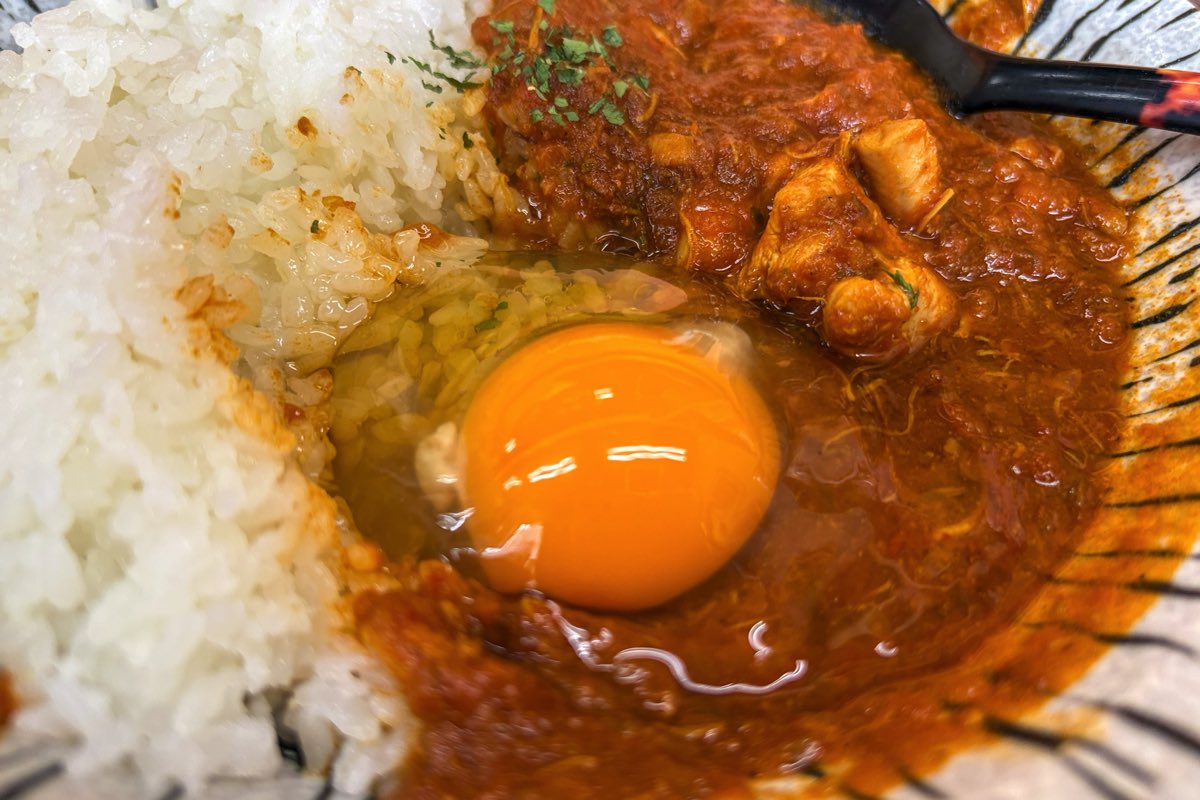 辛さを少しマイルドに味変するなら、生卵をプラスして。忍野村の自然豊かな環境で伸び伸びと育った田辺養鶏場の新鮮卵はぷりっと弾力があり、意外にさっぱり。上品な甘みが何ともまろやかにスパイシーカレーを包んでくれる。