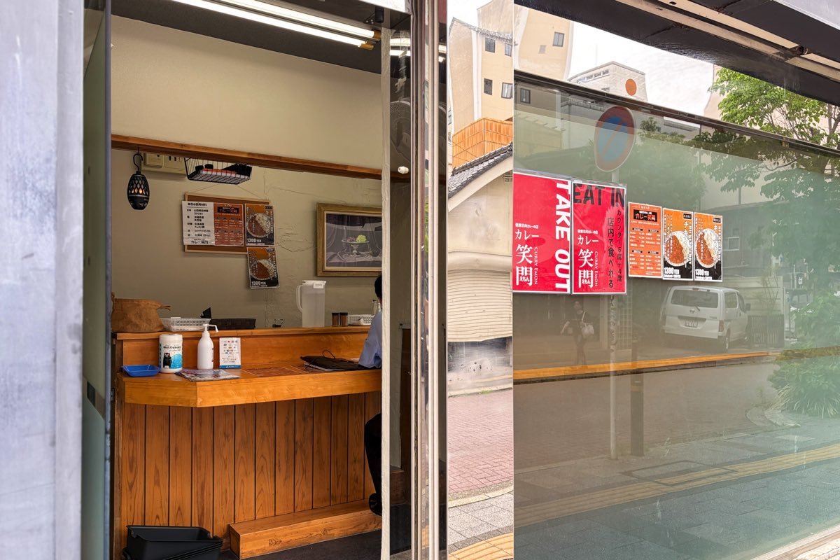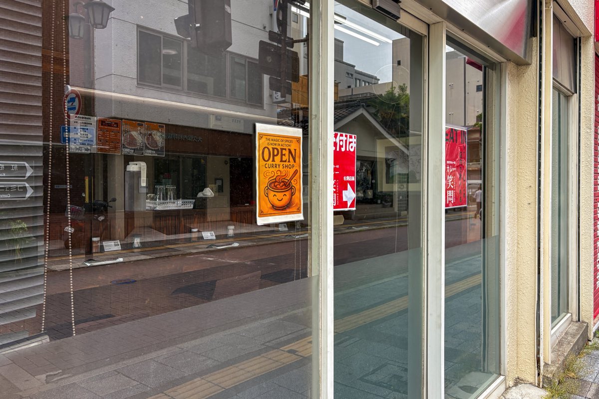 紅梅通りと舞鶴通りの交差点、市役所東の信号のところに2025年4月4日オープンしたスパイスカレー専門店「カレー笑門」。入口は道路側から見て右側にある。