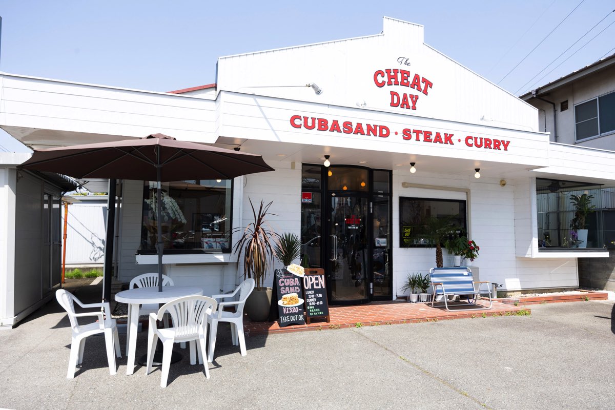 真っ白な建物に赤い「CHEAT DAY」の文字。アメリカンな雰囲気漂うここ、「CHEAT DAY 山梨」は甲府市大里に2025年4月19日オープンしたステーキライスとキューバサンドのお店。