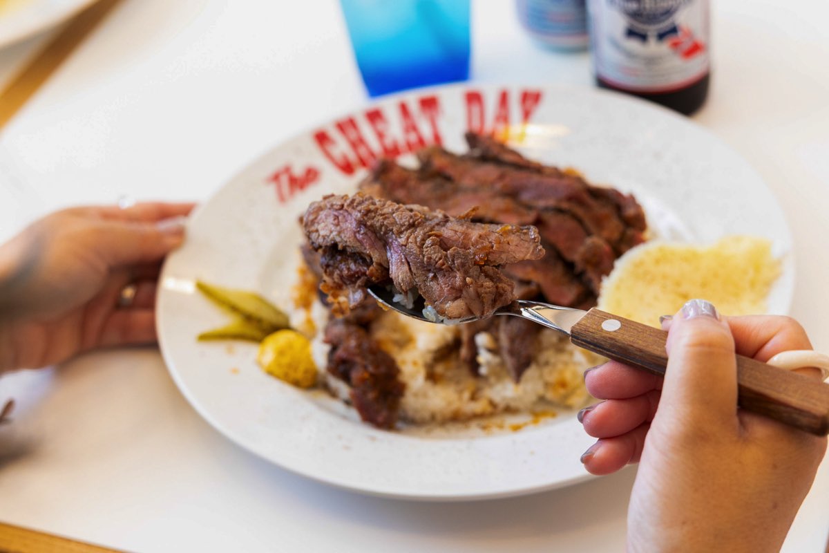 程よい焼き加減でやわらかなステーキを頬張れば、口の中でフレッシュな脂と肉汁が溶けていく。醤油ベースのオリジナルソースがこれまた美味しさを倍増し、ごはんが進む進む~。