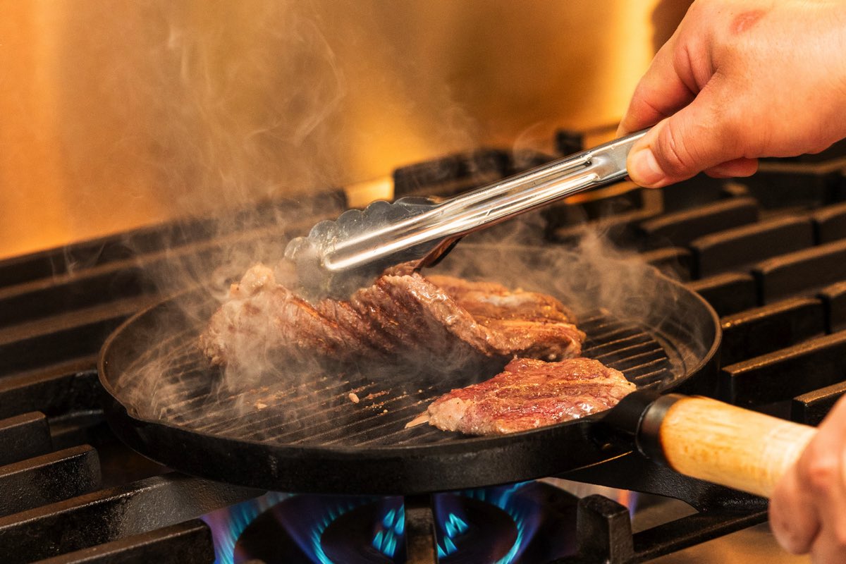 分厚いステーキの肉汁を逃がさずに、柔らかジューシーに豪快に焼き上げる。ジュゥゥゥっと煙が立ち上り、肉の焼き音を聞き分け、火加減をコントロールしながら旨味をとじ込める技もさすがだ。
