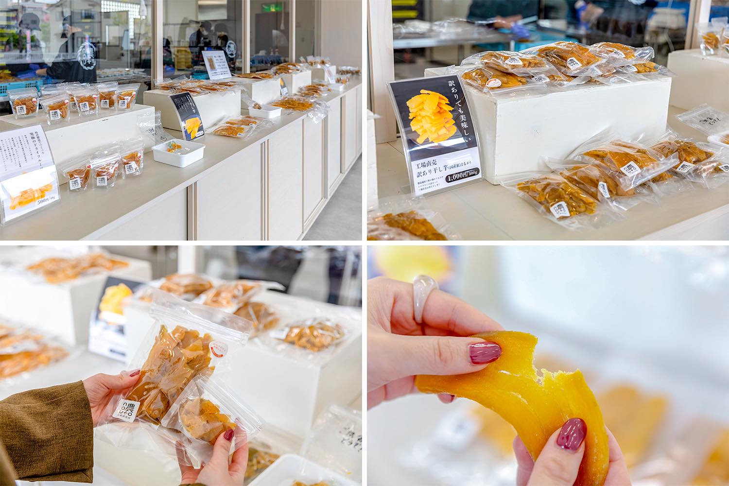 乾燥時間にこだわる干し芋やドライフルーツも並び、試食もできるのでお気に入りを見つけて。