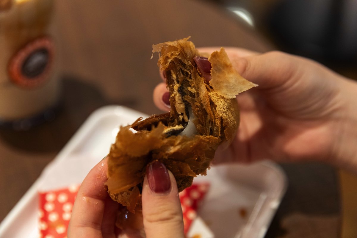 焼き立てパリッパリクロワッサンの中から、求肥フィリングがとろ~り。さらに、濃厚なきな粉チョコと黒みつクリーム…これぞ、「サンマルクカフェ」と「桔梗信玄餅」の魅力を詰め込んだ最強タッグだ。
