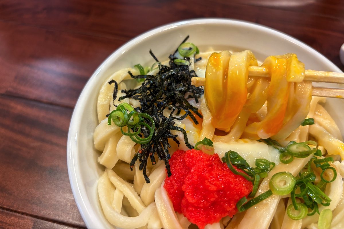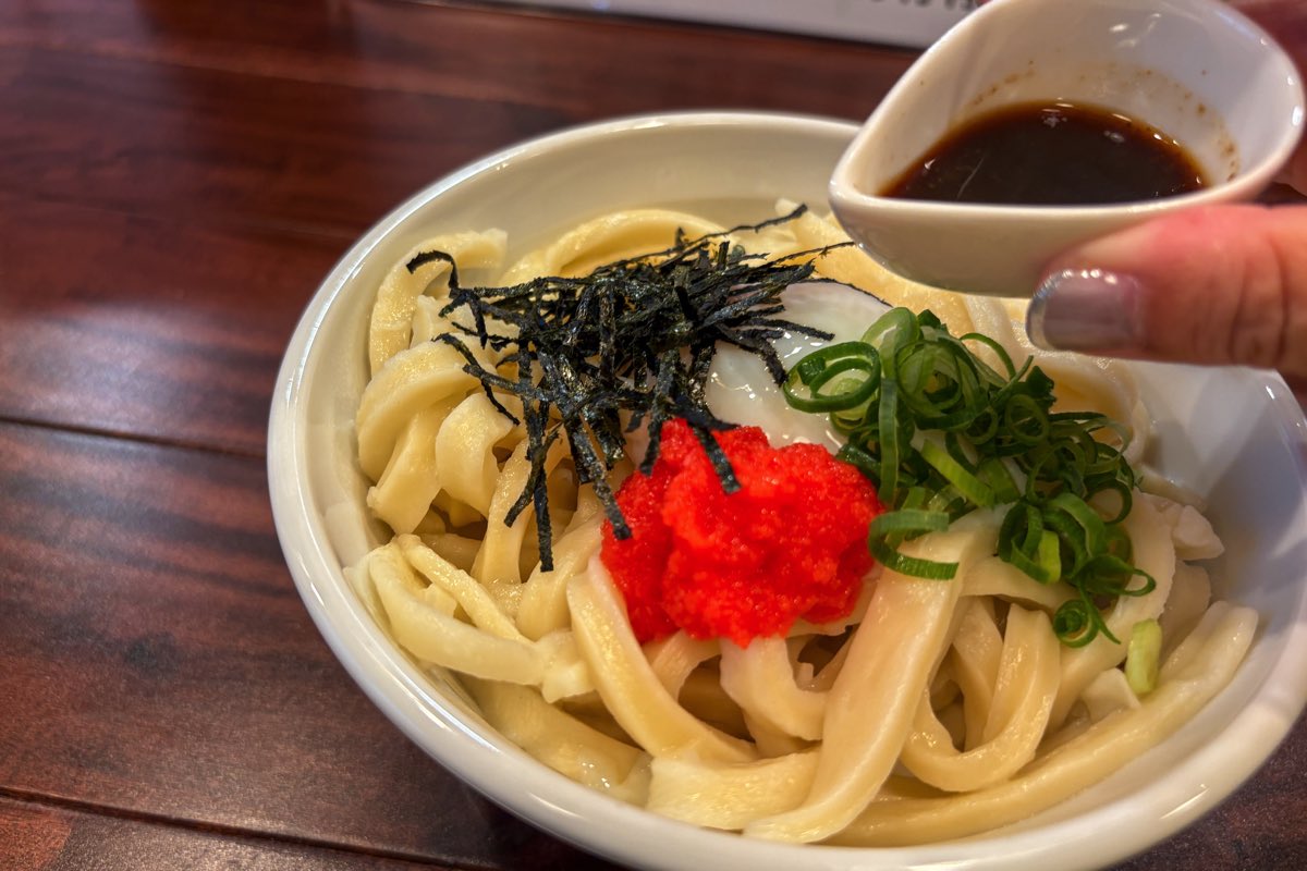 本日は、今回初めて登場したという数量限定の「明太釜玉うどん」を実食~♪オリジナルの生醤油をまわしかけていただく。