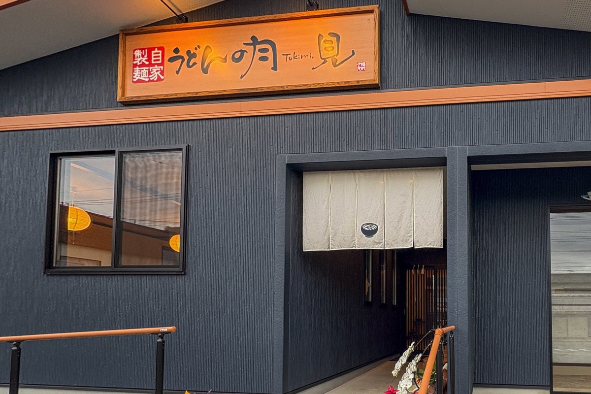 モノトーンのシックな佇まいが何ともスタイリッシュな「自家製麺 うどんの月見」。駐車場も広々として駐車しやすいのもいい。人気店のため、ランチどきには行列ができることも。