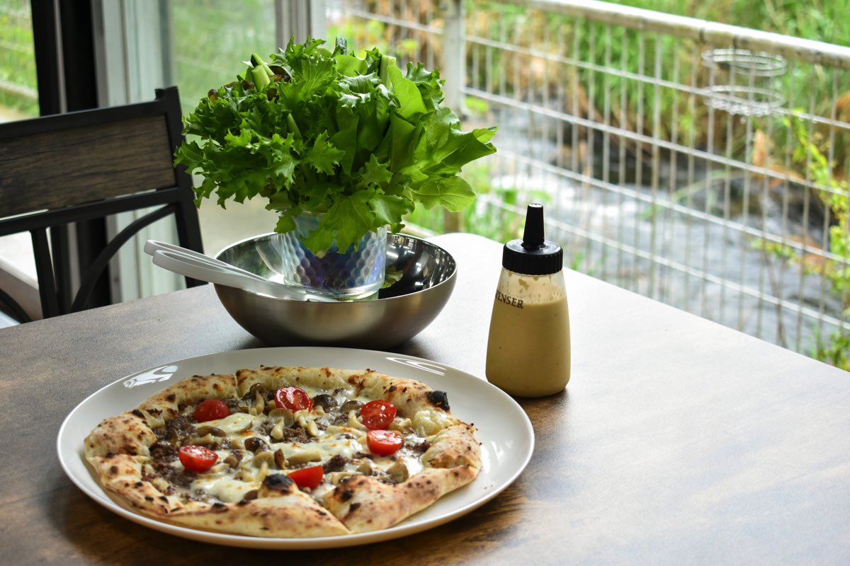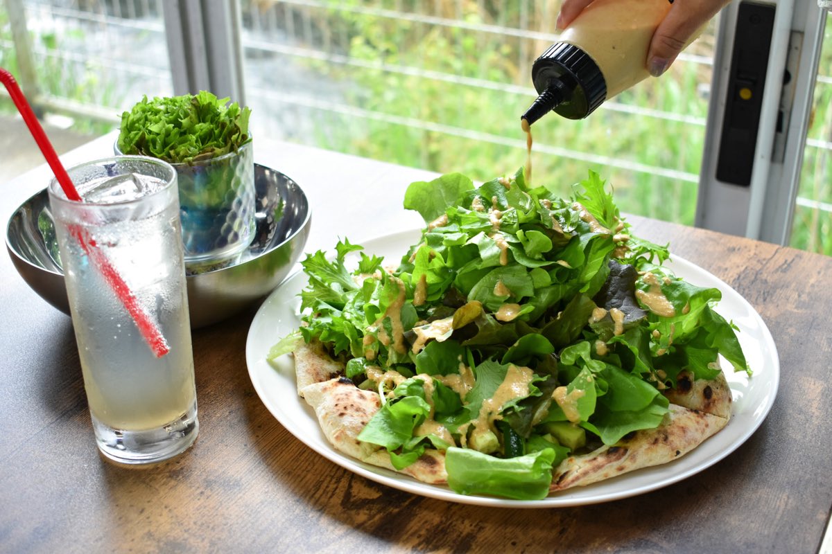 これぞ、山梨ならではの素材を組み合わせた、山梨育ちのもりもりサラダぴざ!山梨県産野菜と山梨県産オーガニック卵、ごまで、ボスが手作りした自家製ドレッシングをかけていただけば、もう最高~!!いくらでも食べられそう。