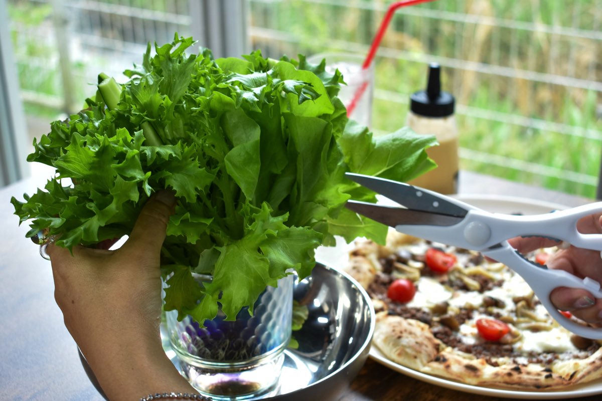 地元の農家さんが丹精込めて作った、なんと3種類が1株になった根っこ付きのリーフがドーンとまるごと!チョキチョキ自分で切って、ワイン王国・山梨ならではのワインの搾りかすを食べて育った、小林牧場の甲州ワインビーフの上へ。