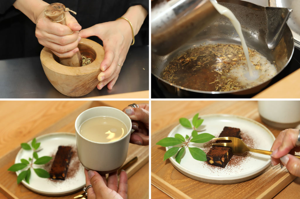 食後のお茶とスイーツには、富士北麓のチャイと小麦粉や砂糖を使わない非加熱のローブラウニーを。カフェインや刺激の強いスパイスは加えず、富士山の麓に自生するクロモジやアブラチャンを香らせたオーガニックチャイは、煮だすところからスタート。