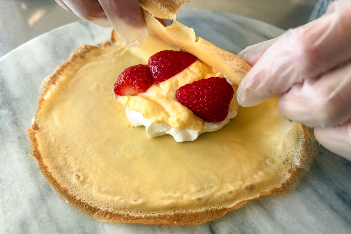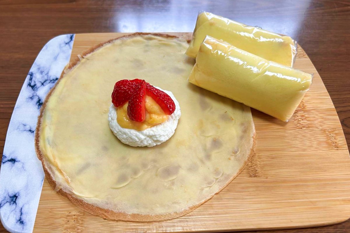 中でも、お店のイチオシは「米粉のクレープ」!米粉を使ったグルテンフリーの生地が特徴で、フルーツとカスタード、生クリーム2種類のクリームを包んだ自慢のひと品だ。