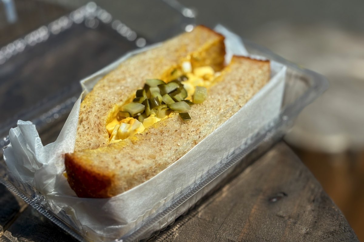 全粒粉の香ばしさと自然の甘みが楽しめるパンに、清里のたまごをたっぷり使ったフィリングを溢れんばかりにサンドする。たまご本来の濃厚な味わいに手作りマヨが優しく寄り添い、1本漬けしたきゅうりの自家製ピクルスが食感のアクセントに。