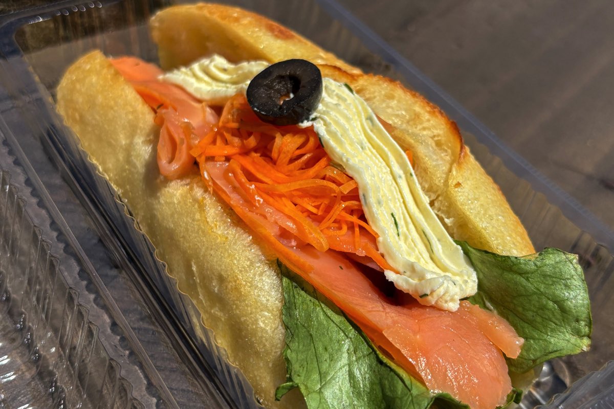 スモークサーモンにオニオングリルピクルス、クミンをきかせたキャロットラペのサンドも、さっぱりとしたサーモンに人参の歯ごたえとクミンの香りがよく合い、暑い夏にピッタリだ。