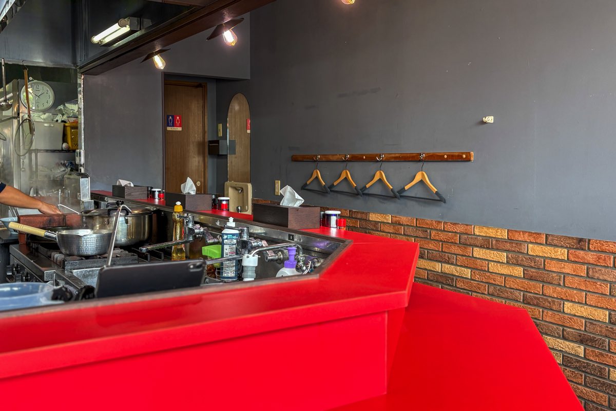 店内へ入ると、厨房をぐるりと囲む真っ赤なカウンター席が印象的だ。