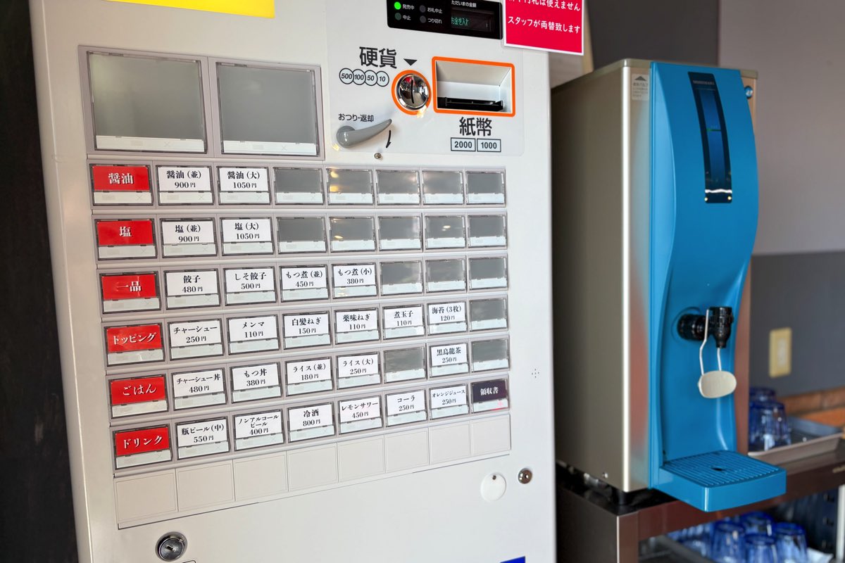 まずは券売機で食券を買うシステム。ラーメンは塩と醤油の2種類で、並と大が選べる。
