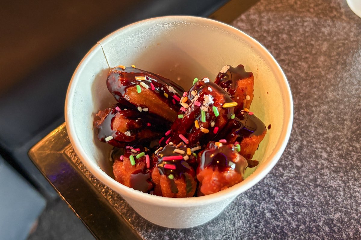 カップ入りのチュロスには、「シュガー」、「シナモン」、「チョコソース」など、約7種類のフレーバーがお目見え!カリっとふんわり食感がやみつきになり、どのフレーバーにも相性抜群♪