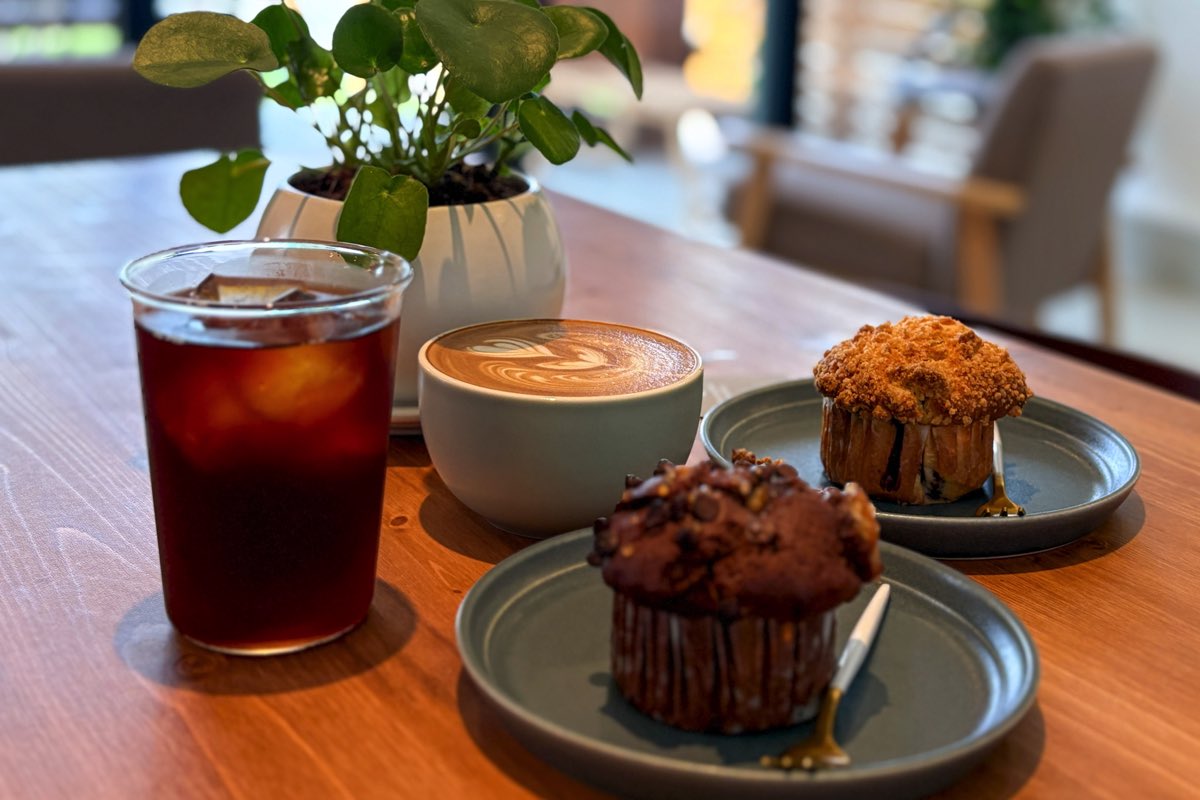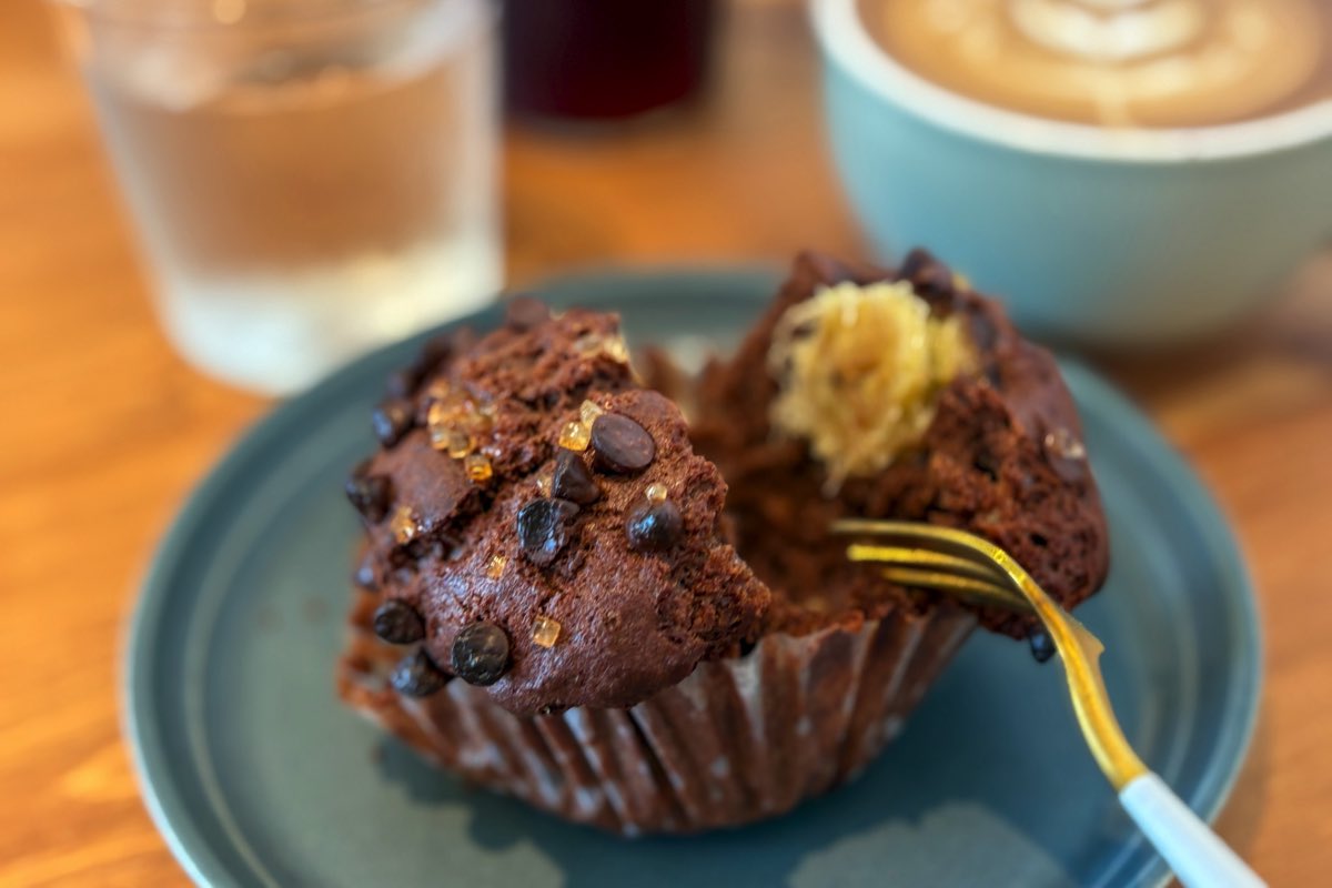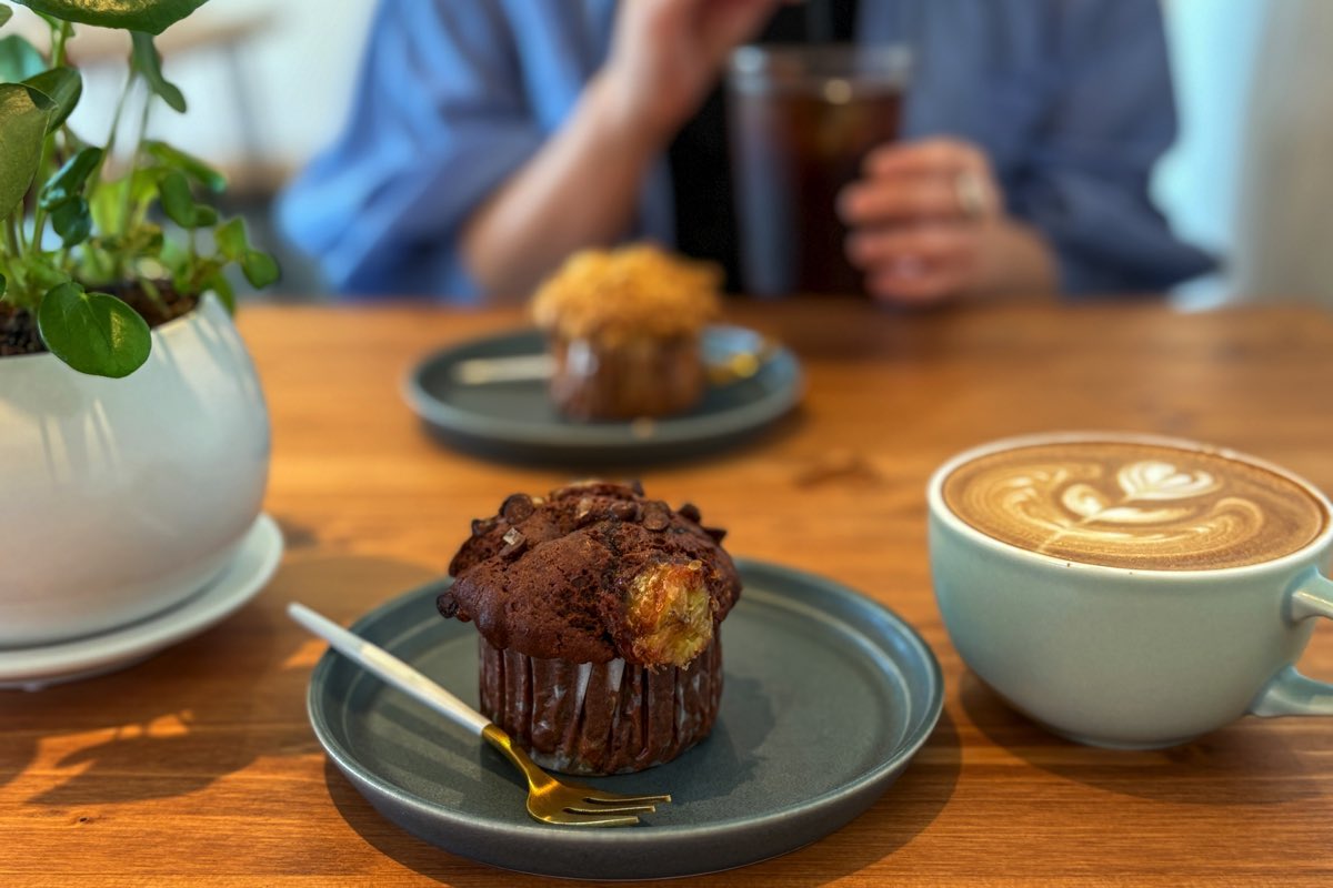 まずは、焼きたてのチョコバナナマフィンとラテを。コロンビアの中深煎りで、ほのかな酸味と程よい苦み、甘みもしっかりあって、ミルクとの相性も抜群だ。