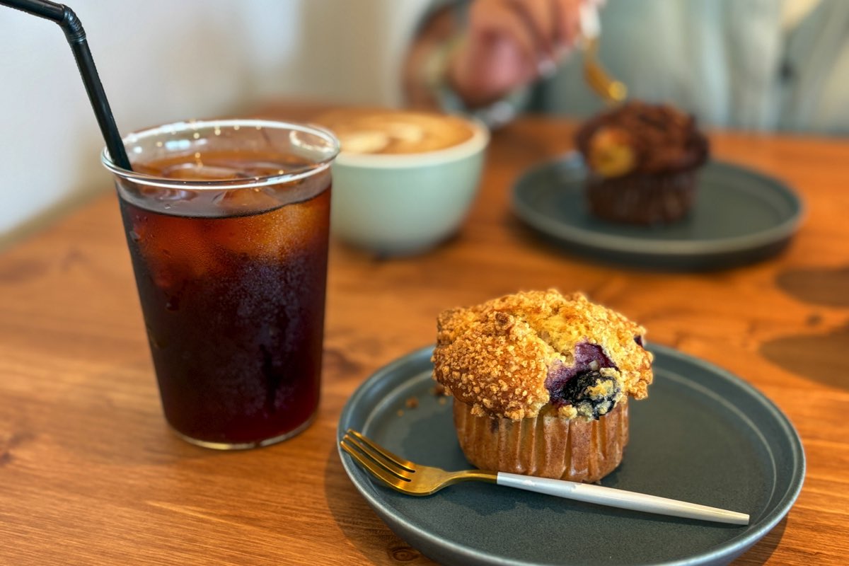 ブルーベリークリームチーズマフィンの上にはクランブルをあしらい、サクサクと小気味いい食感が。
