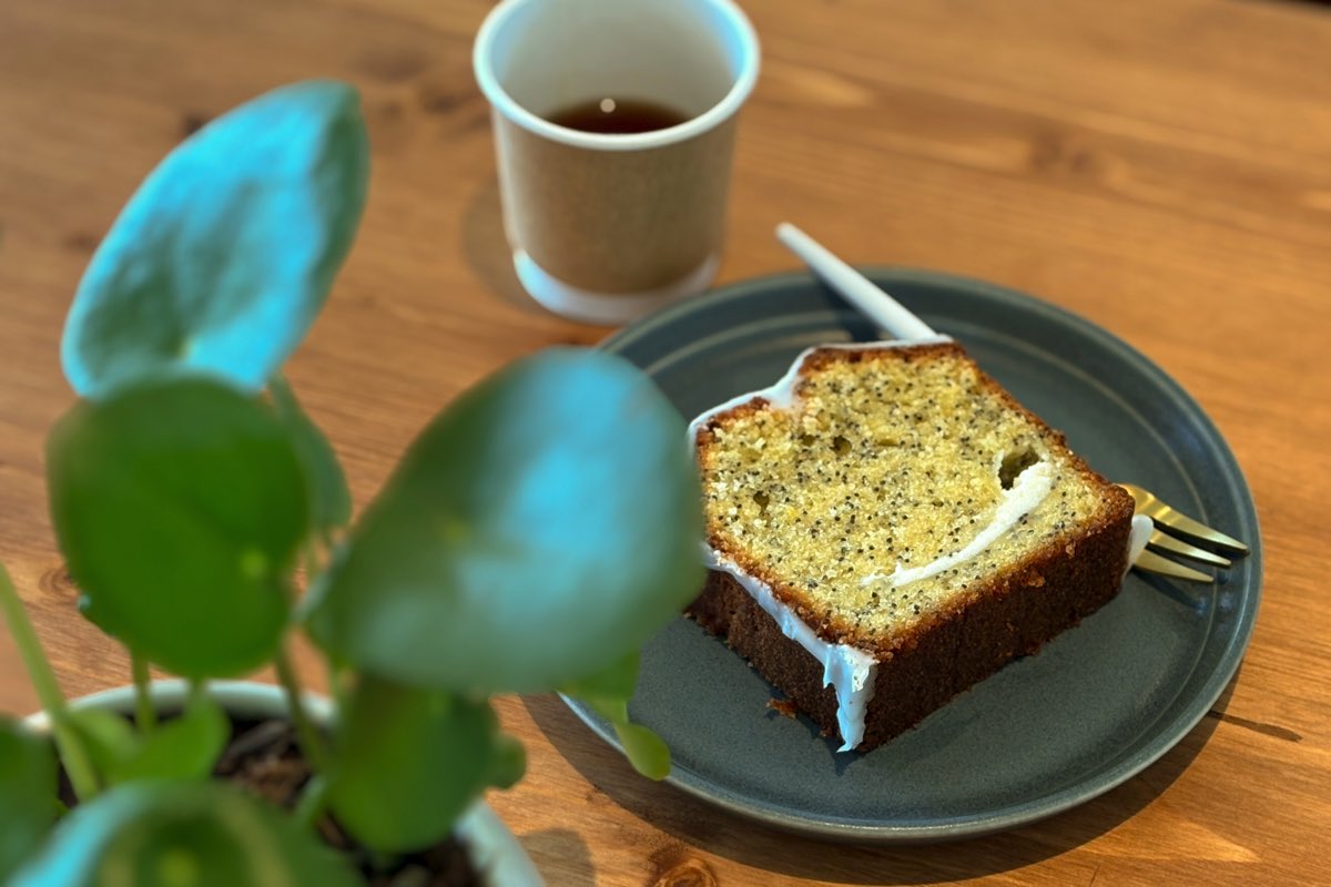 先程完成したばかりのレモンポピーシードパウンドには、お味見のエチオピアの浅煎りを添えてくれた。これがまた、さすが見事なペアリング!!