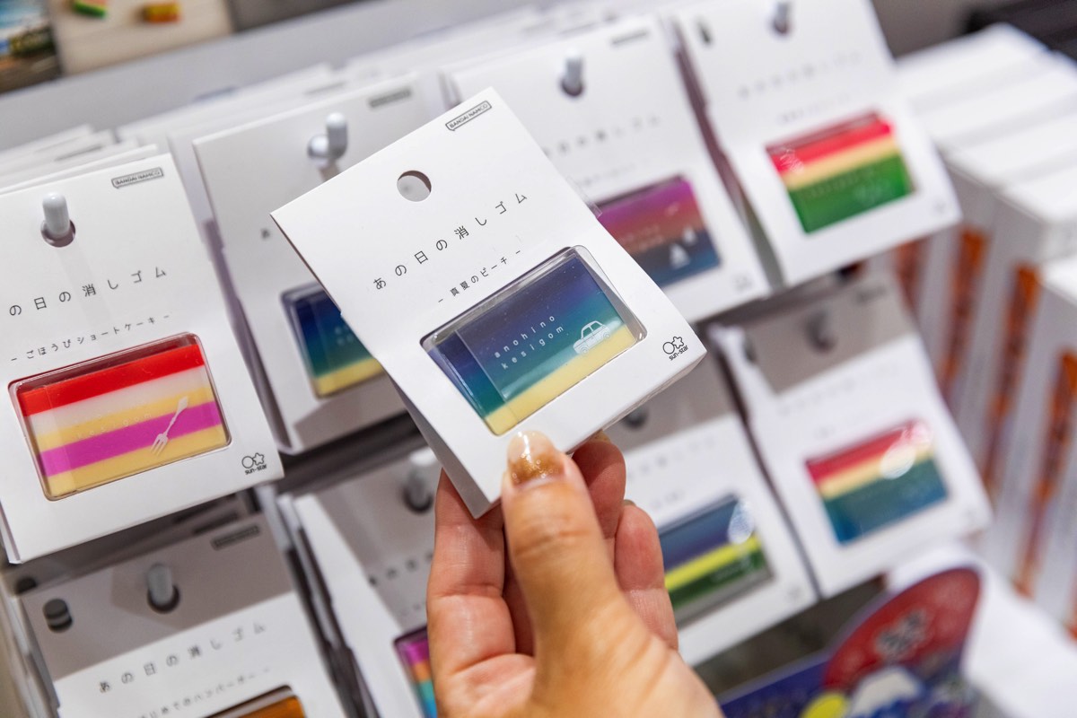 名前がその場で入れられるペンはギフトにも喜ばれそう。色のグラデーションが何ともかわいい「あの日の消しゴム」なるものも発見!どこか懐かしく、あの日の思い出や風景を切り取ったような色あいで、「はじめてのハンバーガー」「真夏のビーチ」「ごほうびショートケーキ」「わたあめ空の帰り道」など、キャッチコピーもポエミーでキュンキュンしちゃう。