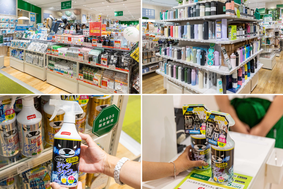 尋常じゃない暑さが続く山梨では、日焼け止めや日傘、ネッククーラーなどの暑さ対策グッズが特に充実!水分補給のために欠かせない水筒も種類豊富でカラーバリエもいろいろ♪中でも注目はHANDS限定販売の、衣服に吹きかけるだけでひんやりするという「シャツシャワー」!これは営業マンのパパとサッカー男子の息子のために即2本買いしました♡