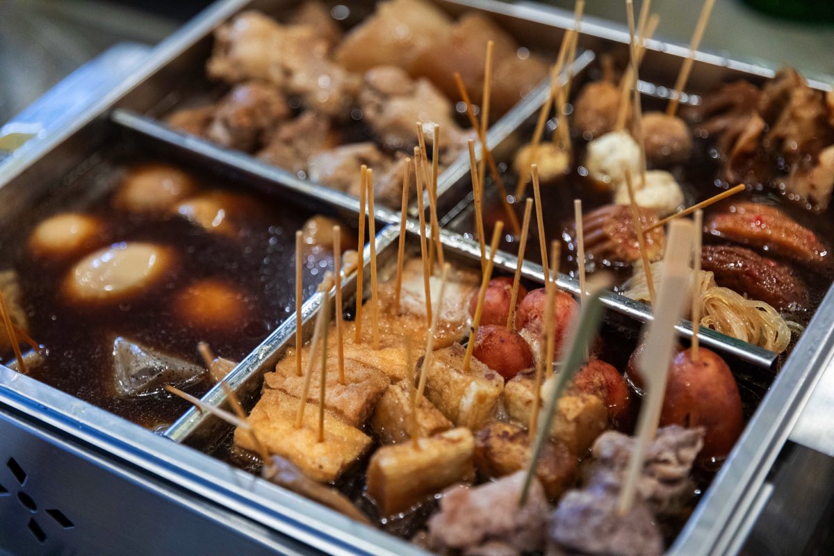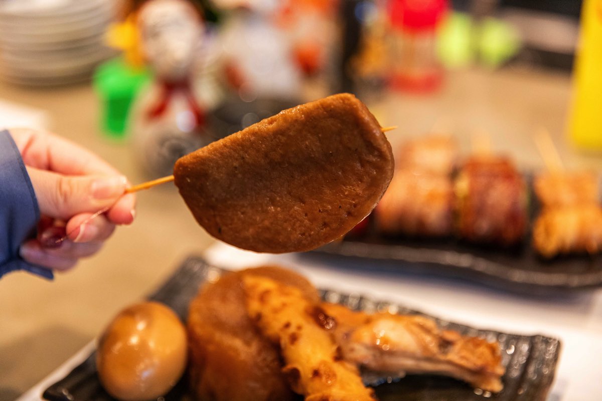 牛すじを煮た出汁に昆布やかつおを合わせた黒いスープが特徴で、静岡本場の味を再現しつつ、呂まんオリジナルの風味に仕上げる。約12種類の具材を、出汁の海にインしてグツグツと煮込み、旨味を浸透させていく~。