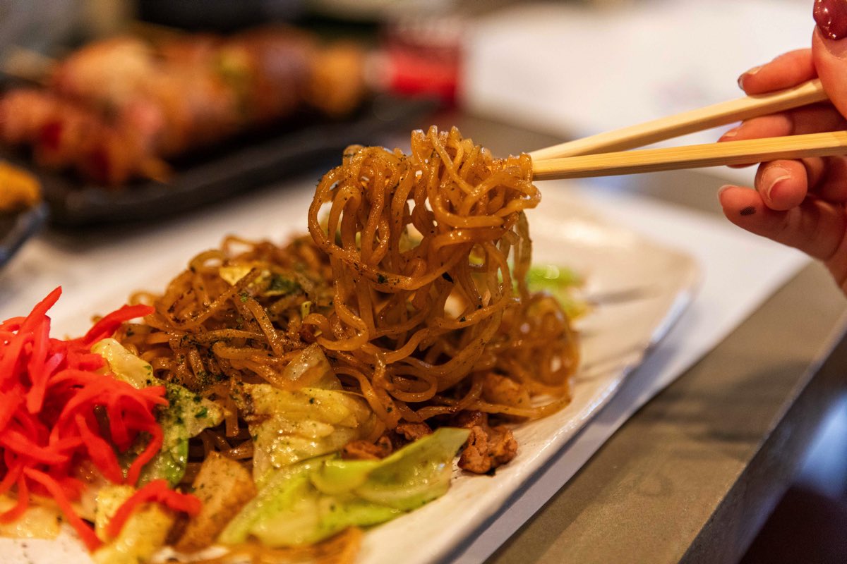 〆にぴったりなのは、静岡のご当地グルメ「富士宮焼きそば」。ソースや魚粉の香りを纏った硬めの麺が美味しすぎて、箸が進む~。