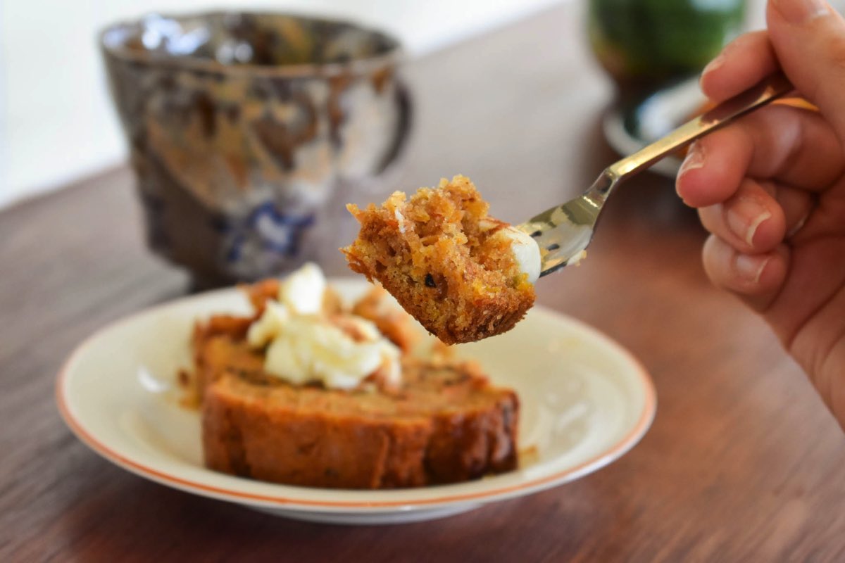 「キャロ活」とも呼ばれ、一躍ブームになったキャロットケーキも実食!クリームチーズのフロスティングを上にぬらず、あえて添えることで、ひと口ずつ好きな量をのせて食べられるような工夫が嬉しい。