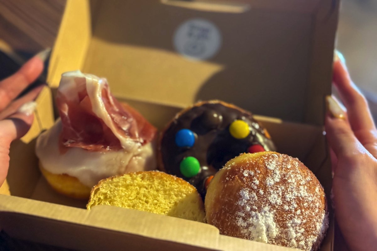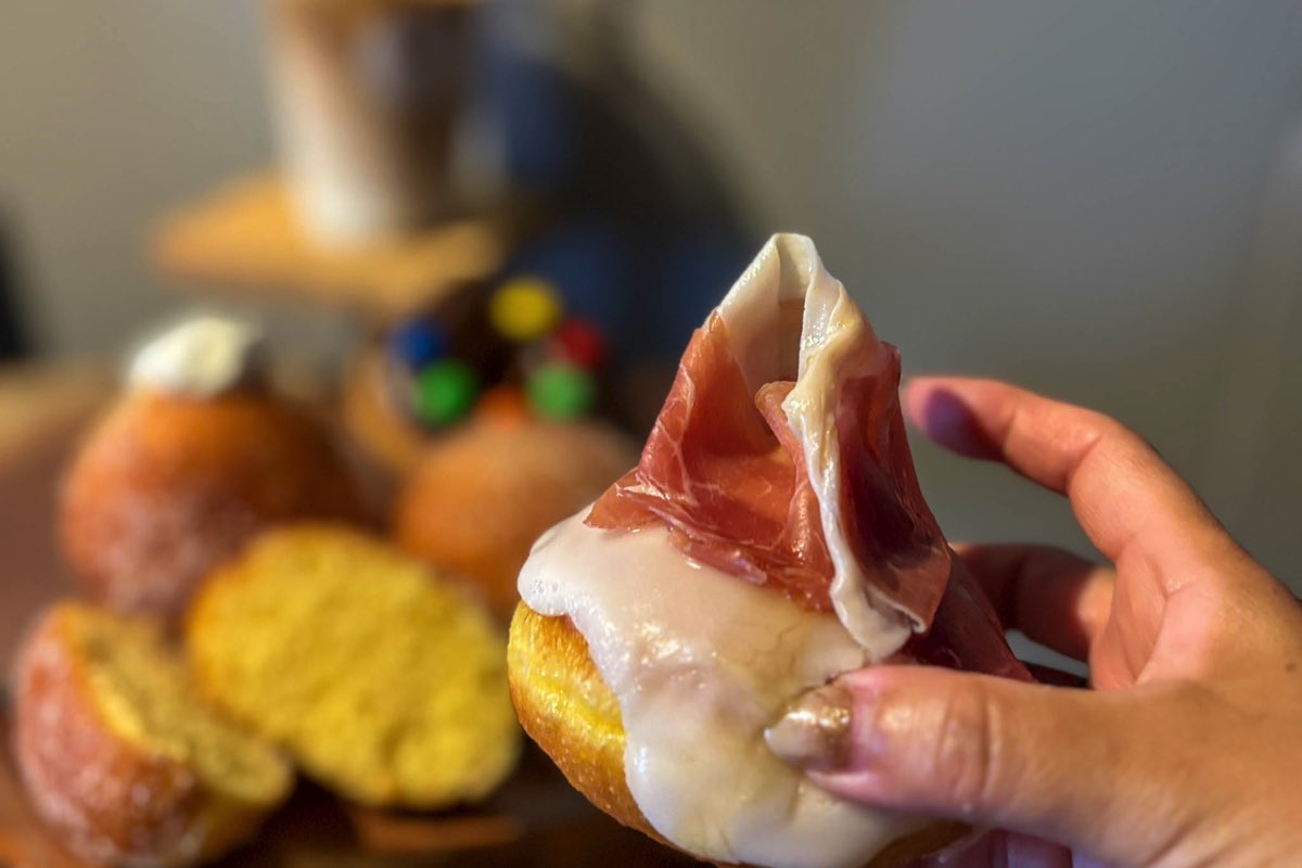 イチオシは、甘いアイシングとプロシュートの塩味が斬新なこちらのミール系。メープルシロップを纏い、やみつき甘じょっぱドーナツの出来上がり~。