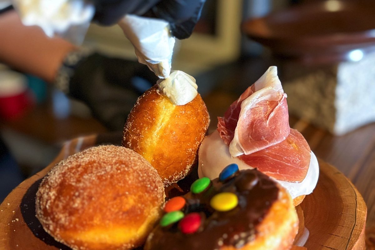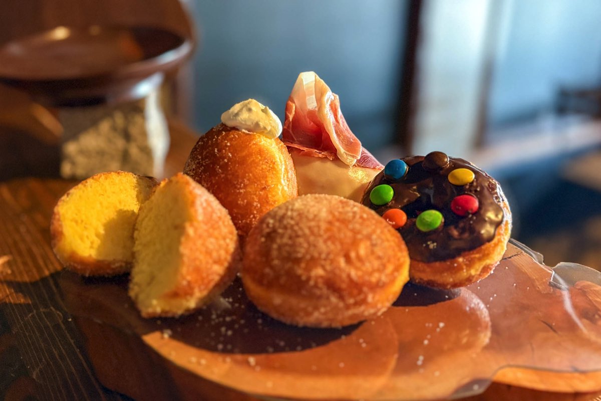 もちっとした生ドーナツ生地にもほのかに塩味もきかせ、全体のバランスを整える。贅沢にあしらったプロシュートは見た目のインパクトも大!