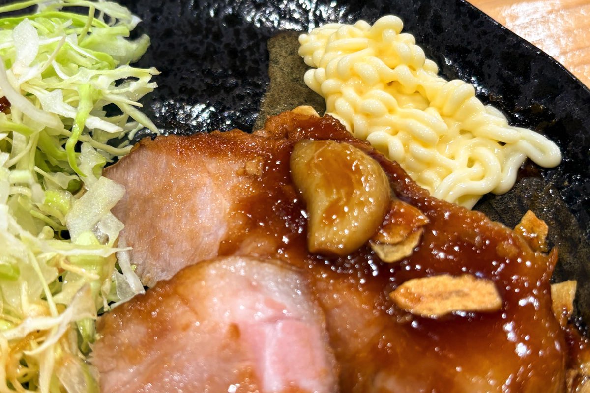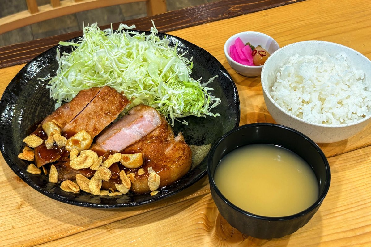 フライドガーリックや丸ごと揚げたニンニクがごろっととんてきソースと絡み、何ともギルティないで立ちで着丼だ。豚肉1枚でもこのボリューム感とはすごい!!
