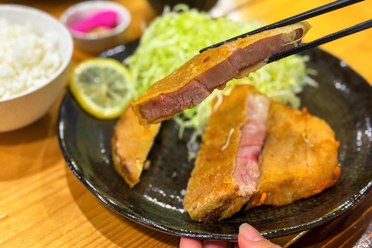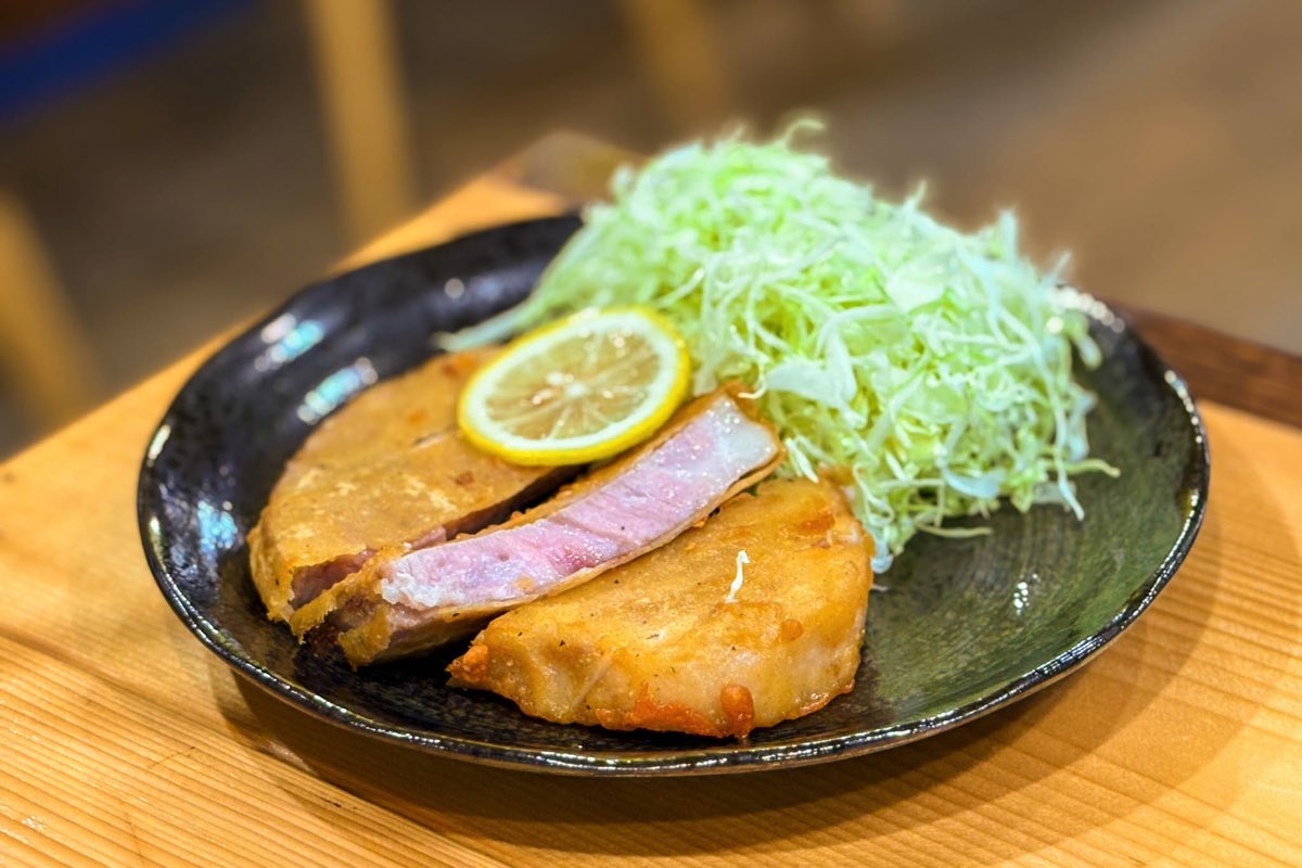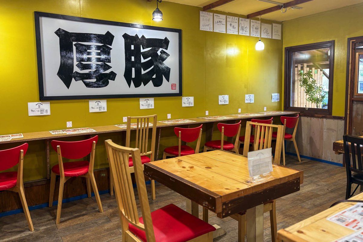 店内には「厚豚」のインパクトある文字がダイナミックに掲げられ、店主の意気込みが感じられる。メニューはどれも厚切りのレア豚で、1枚から8枚まで(からあげのみ4枚まで)を選べ、ごはん、小鉢、味噌汁付きという嬉しい定食スタイル。