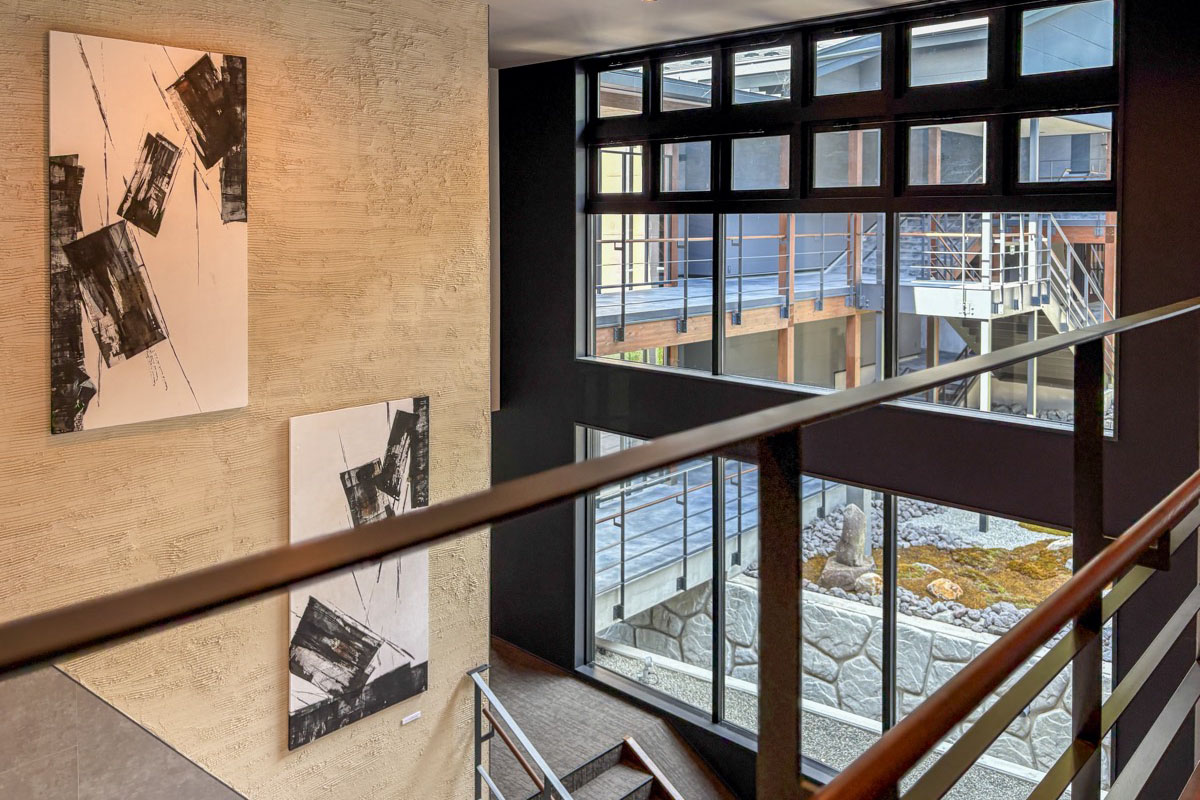 木造2階建ての和風建築で、館内はシックでスタイリッシュな雰囲気。重厚な落ち着きのある空間が広がる。