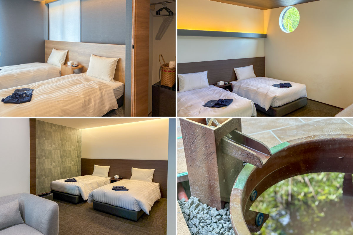 客室は21室。2部屋をつないで二世帯の家族や大家族の最適なスペシャル空間を実現するコネクティングルーム4室、露天風呂付きデラックスツイン5室のほか、車いすでも利用可能な丸窓を採用したスタイリッシュなユニバーサルルームなど、バラエティに富んだ客室タイプがある。