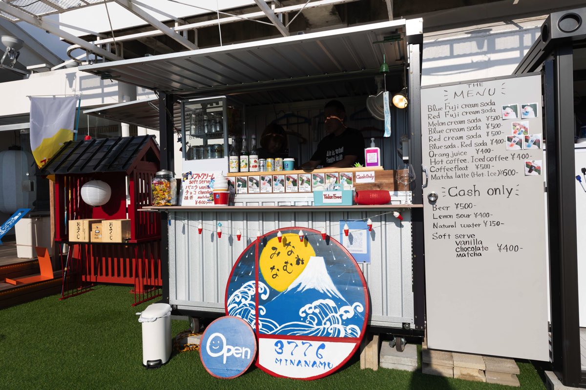 富士急ターミナルビル Q-STA屋上にて、2025年7月からプレオープンしているクリームソーダ専門店「みななむ」。店名のみななむ=3776、皆さんもうお分かりかな?そう!日本最高峰の富士山の標高~。ここは富士山が見える絶景屋上カフェなのだった。
