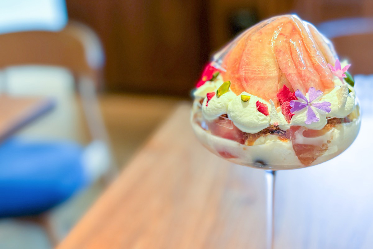 北杜市のフレンチレストラン「contrast」併設カフェで楽しめる、パティシエ渾身の美しすぎる桃パフェ…。見ているだけでウットリ、食べるのを思わず忘れてしまうほどの美しさなのだ。矢崎屋ファームの瑞々しくて甘~い桃をたっぷりと使っていたり、減圧桃でフレッシュとコンポートの両方の美味しさが味わえたり、桃パフェの醍醐味が味わえるのはもちろん。ここからがパティシエの技!塩メレンゲを砕いてあしらい、ほんのりとした塩味で山梨ならではの夏を彩る逸品に仕上げる。