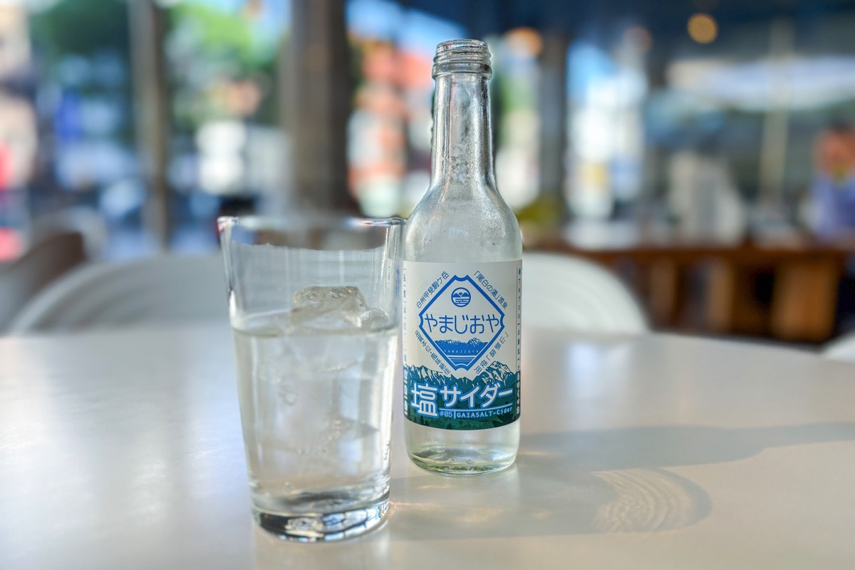 防災新館1階にあるカフェの涼やかなご当地塩サイダー!甲斐駒温泉「尾白の湯」源泉を丹念に煮詰めて作った、南アルプスの山脈塩のサイダーだ。シンプルな透明の瓶にブルーの文字が何とも清涼感に溢れ、氷の入ったグラスに注いでグビッ。ほんのりとした塩味に甘さもあり、飲みやすく爽やかなのど越し。炭酸もそれほど強くないので、ゴクゴク飲めちゃう。夏にピッタリの1杯といえそう。